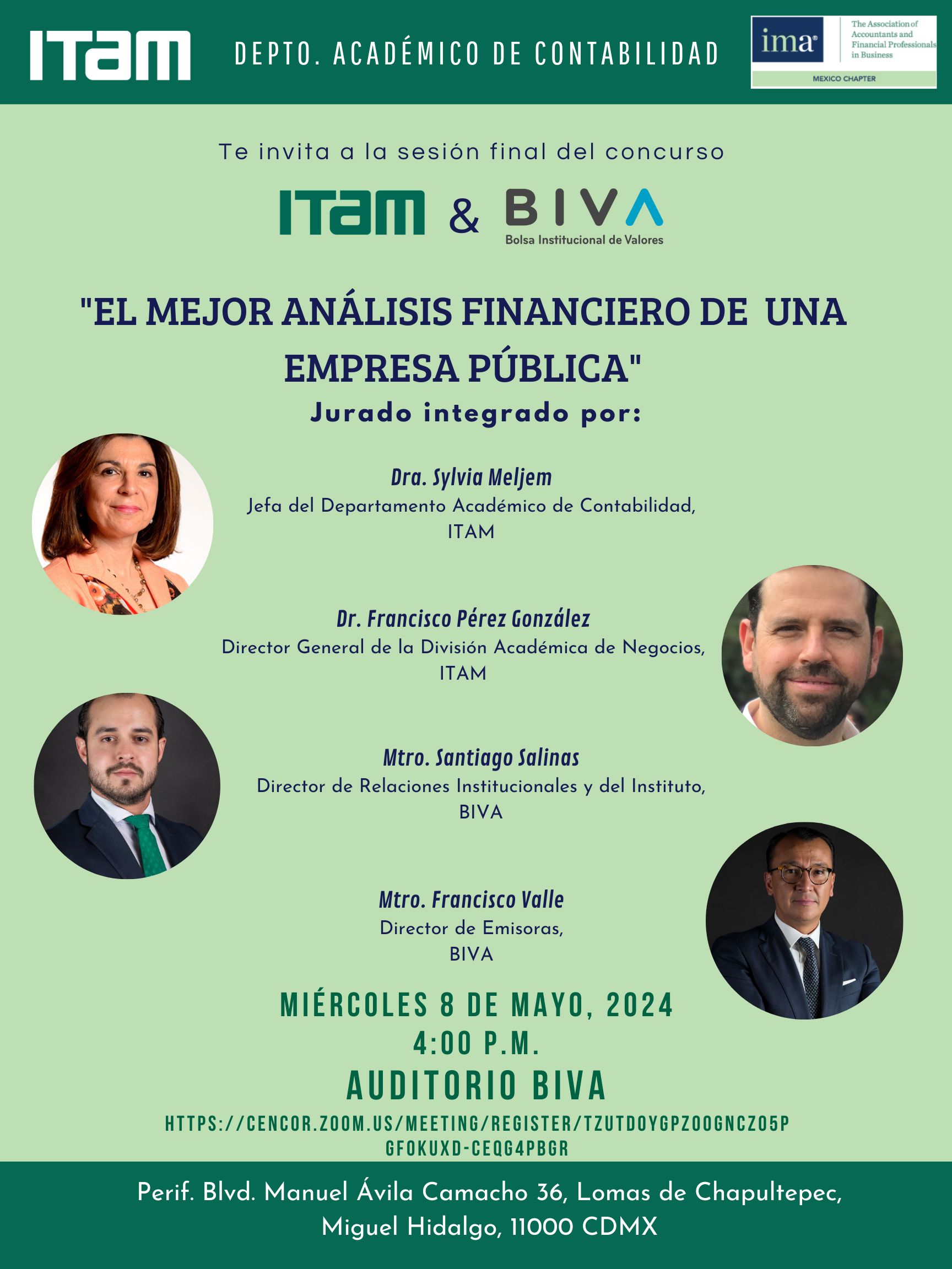 El jurado estará integrado por: El Mtro. Santiago Salinas, Director del Instituto BIVA, el Dr. Francisco Pérez González, Director General de la División de Negocios del ITAM, la Dra. Sylvia Meljem, Jefa del Depto. Académico de Contabilidad del ITAM y el Mtro. Francisco Valle, Director de Emisoras de BIVA.