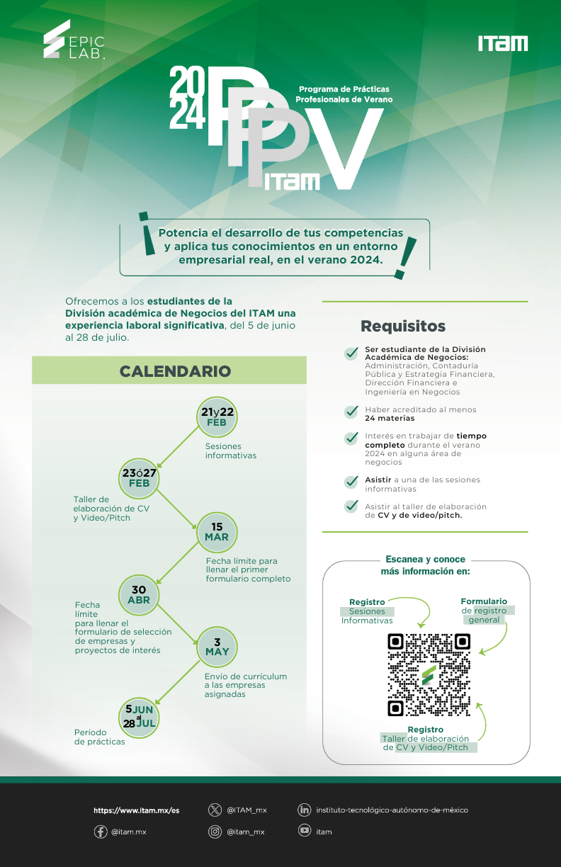 Con el objeto de enriquecer la formación académica de nuestros estudiantes, la División de Negocios del ITAM ha diseñado el Programa de Prácticas Profesionales de Verano 2024, para las licenciaturas de Administración, Contaduría Pública y Estrategia Financiera, Dirección Financiera e Ingeniería en Negocios.